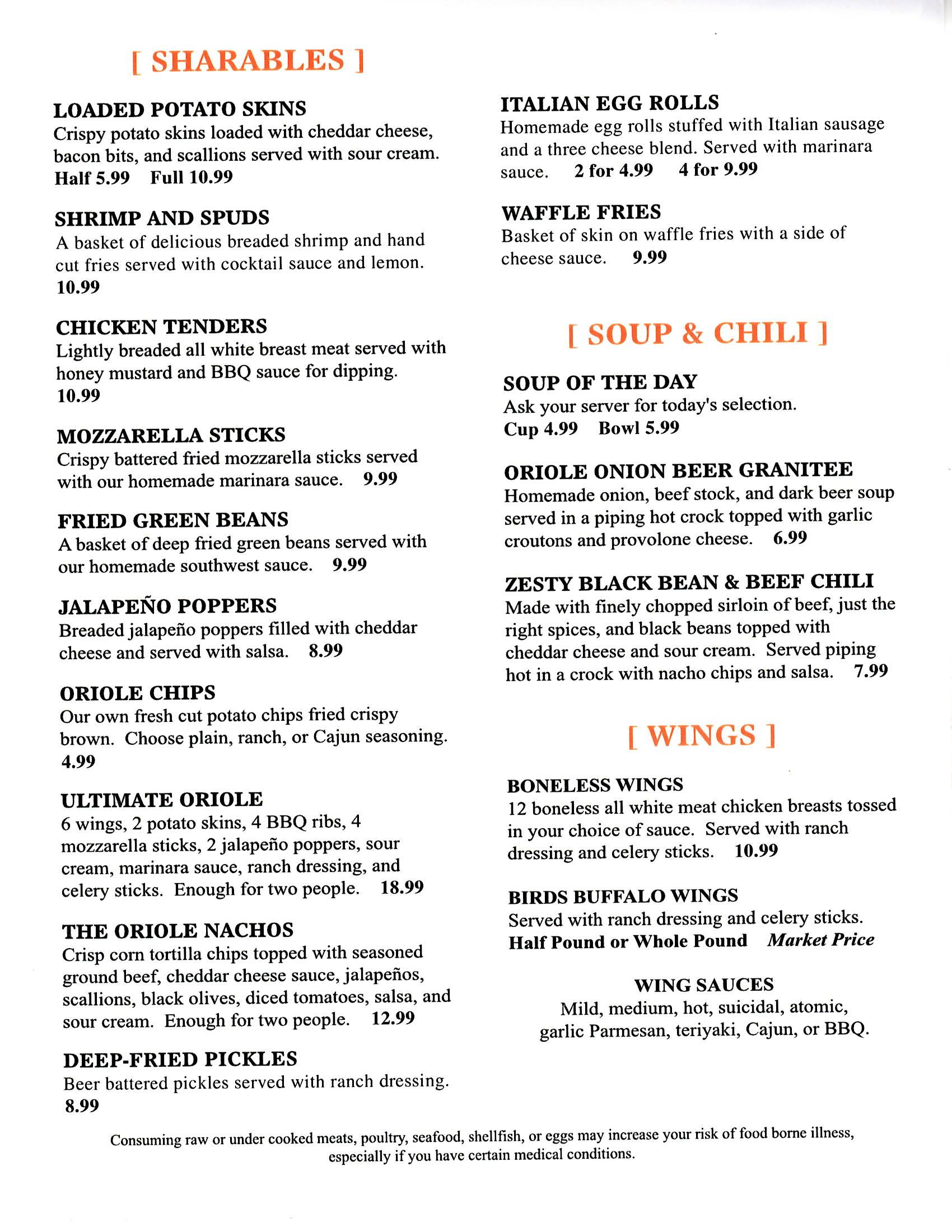 Customers are more like family to us at The Oriole Cafe. You can have date night at The Oriole Cafe or just bring the whole family in for dinner. You can meet the guys for beer to watch the game or have a girls night out. Our patio is a great place for your quick 30-minute lunch break or a leisurely dinner watching the sun go down. There is a large outdoor patio with comfortable chairs and umbrellas to keep you out of sun to eat and drink with music to enhance the mood.