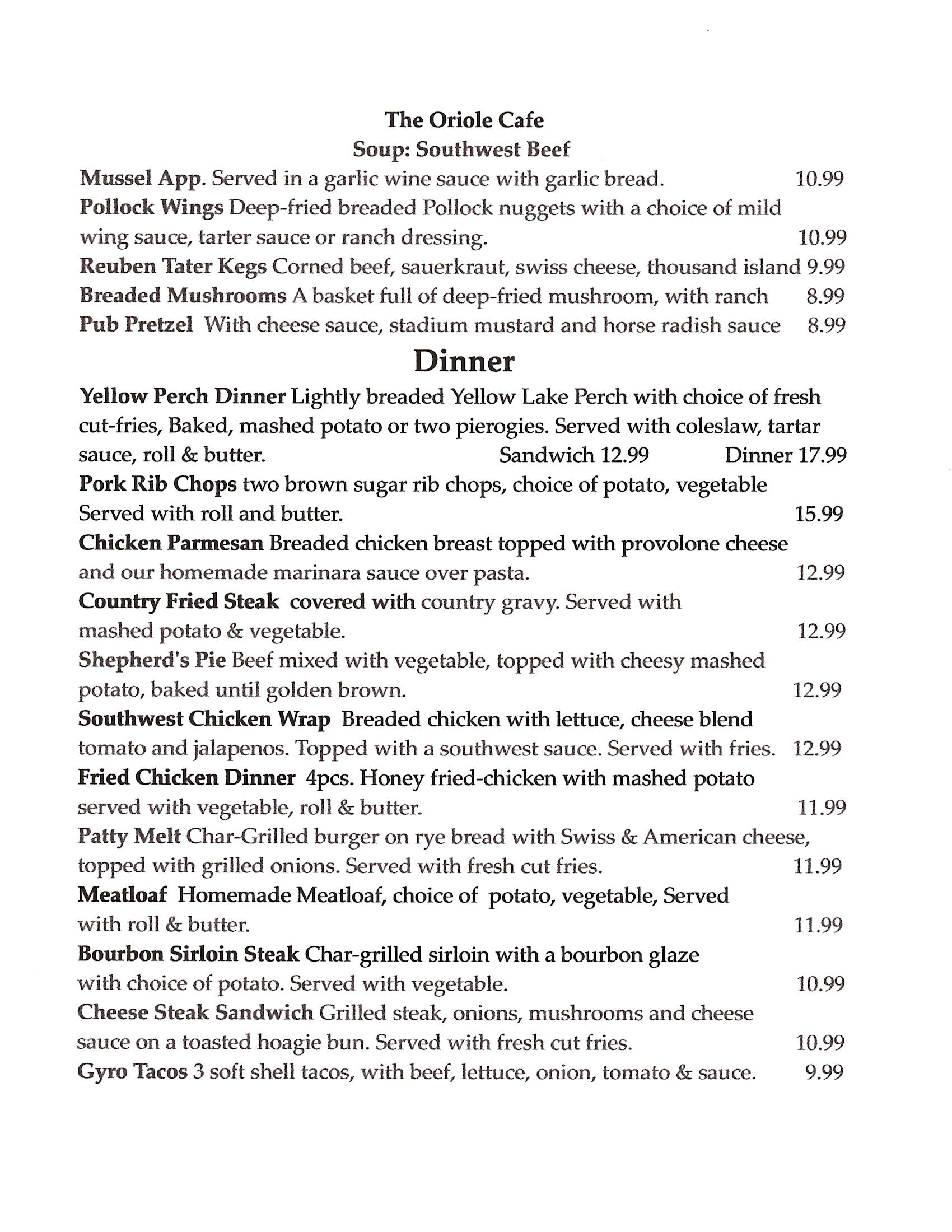 Stop by and join us. You will be served with a smile and the beer is always cold. The Oriole Cafe is not your average neighborhood bar/restaurant. We are always striving to make our customers experience a better one. The more things change, the more they stay the same. It’s called “Tradition.” The Oriole Cafe has a Tradition in Berea Ohio for 90+ years. Our Friday & Saturday signature dishes will keep you coming back. Featuring prim rib, Yellow Perch, BBQ Chicken & Ribs and Pork Schnitzel and many more. Along with all the other normal delicious favorites. The Oriole Cafe has something fore everyone.